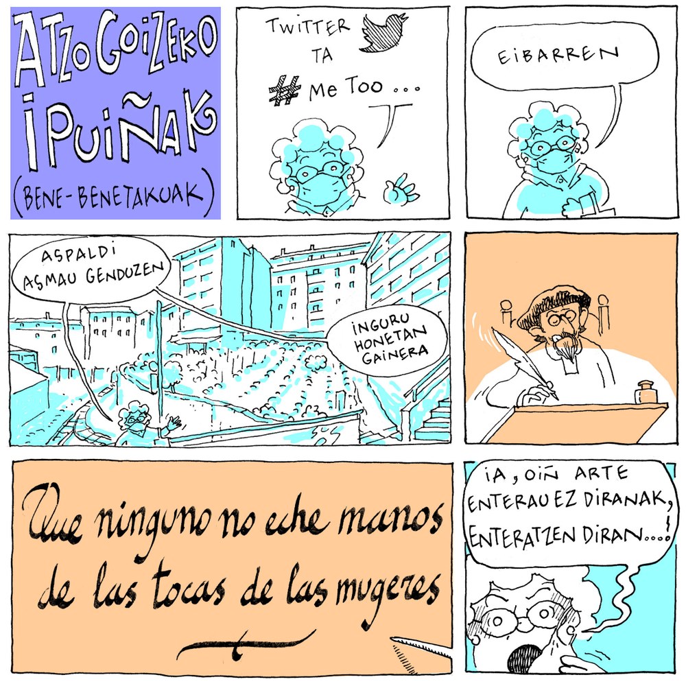 Tampoco eran de poca monta los castigos que se imponían en caso de agresión, escándalo o denuesto (del que dixiere a otro gaso (apestoso) o cornudo; del que llamare a la mujer puta o parida de otro…). Y era una cuestión muy deshonrosa entre las mujeres que agarrasen el tocado de las mujeres casadas o viudas con la intención de quitárselo. Y ese es el tema que ha tratado el dibujante…