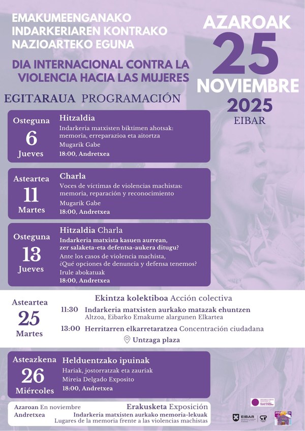 En este 2025, la programación del 25 de noviembre recoge propuestas para conocer lugares de la memoria impulsados por diversos colectivos de todo el mundo para reparar las violencias que las mujeres enfrentamos de manera sistemática; información sobre las opciones de defensa y denuncia de las que disponemos ante los casos de violencia machista con la legislación actual, así como cuentos para personas adultas donde se nos dará la receta para coser bien las heridas.