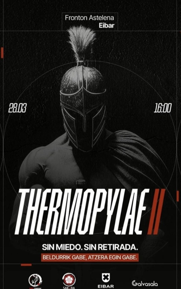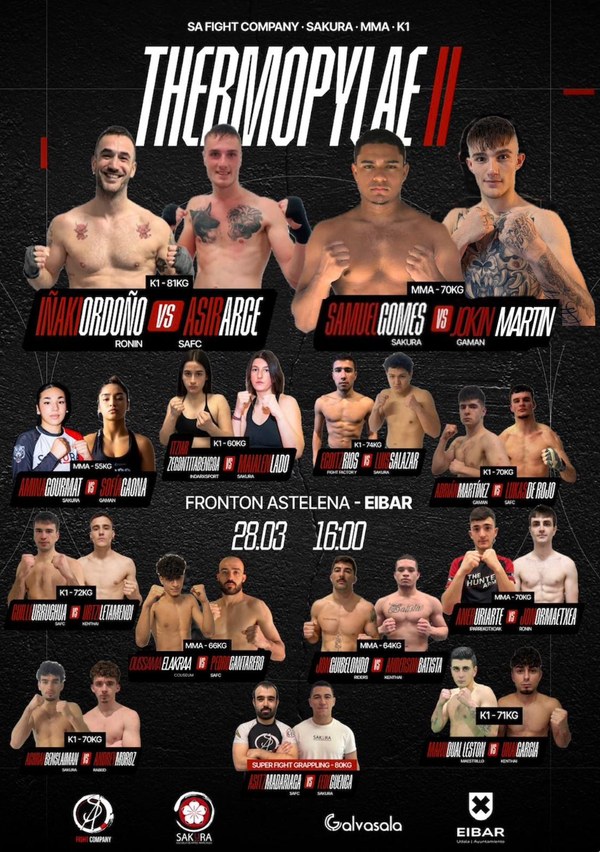 Organizado por SA Fight Company, Sakura Team, Ronin y el Ayuntamiento de Eibar, "Thermopylae" regresará al frontón Astelena con una cartelera compuesta por combates de diferentes categorías y niveles, ofreciendo al público una experiencia intensa y dinámica. Entre los participantes destacan varios luchadores y luchadoras locales que aportan cercanía y generan identificación con el público a partir de las 16:00 horas de este sábado, 28 de marzo. Asismimo, a las 11:00 horas, se procederá a realizar el tradicional pesaje en los arcos de Unzaga.