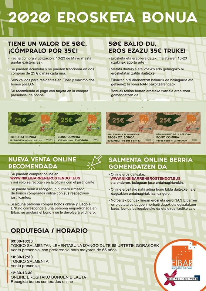 La principal novedad de esta campaña, subvencionada por el Ayuntamiento por Eibar y promovida por Eibar Centro Comercial Abierto (ECCA), es que los bonos tendrán un precio de 35 euros (en anteriores campañas costaban 40 euros) para realizar compras por importe de 50 euros, entre hoy mismo, día 13, y el día 23 de mayo en los establecimientos adheridos a la campaña. Los bonos se pueden acumular y se pueden fraccionar en dos compras de 25 euros o más cada una. Dichos bonos son válidos para residentes en Eibar y un máximo de dos bonos para cada DNI.Además, los bonos se podrán comprar y pagar on-line, sin necesidad de desplazarse hasta los locales de ECCA.