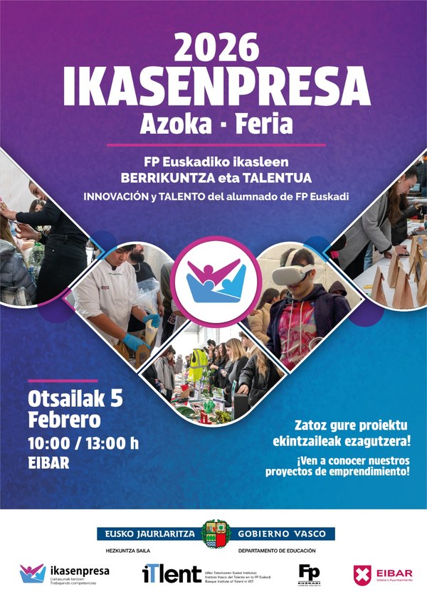 Eusko Jaurlaritzako Hezkuntza Sailak XV. Ikasenpresa Azoka aurkeztu du gaur goizean Eibarren. Azoka otsailaren 5ean egingo da, eta, aurten, ikasleen parte-hartzea aurreko edizioetakoa halako bi izango da. Euskadiko Lanbide Heziketako 61 ikastetxetako 3.000 ikaslek baino gehiagok ikasturtean zehar garatutako 622 proiektu ekintzaile aurkeztuko dituzte. Azokak goizeko 10:00tan irekiko ditu ateak