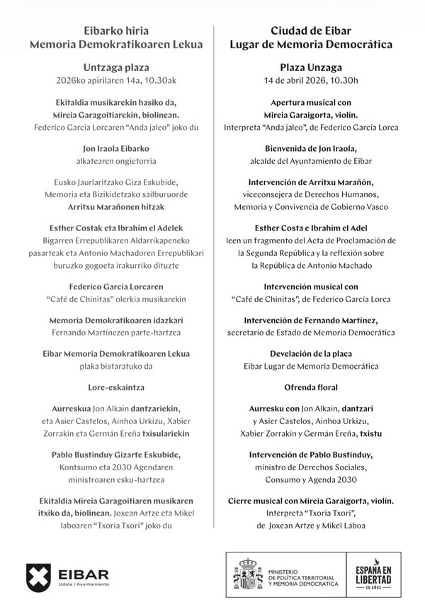 Egitaraua 10:30ean egingo den ekitaldi instituzional batekin hasiko da, ofizialki Memoria Demokratikoaren Leku izendatu den Untzaga plazan. Plaka berri bat jarriko da udaletxean, 1931ko II. Errepublikaren aldarrikapenean izan zuen garrantzi historikoa aitortuz.