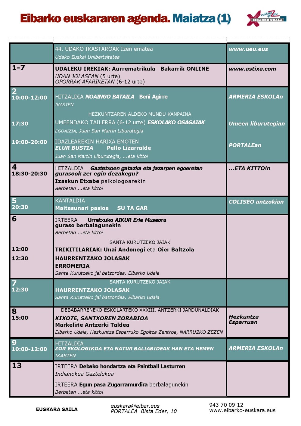 Eibarren maiatzean euskaraz edota euskararen inguruan antolatu diren ekitaldien agenda.